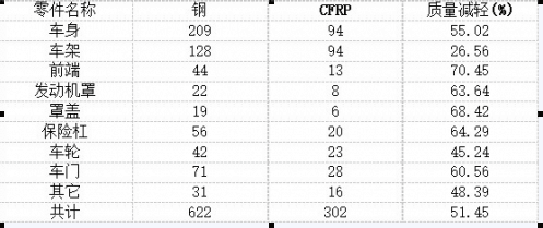 有研究表明:總重量1550千克的新能源汽車續(xù)航里程186公里,如果總重量能減少到1011千克,則續(xù)航里程可提高到275.5公里。我們常見的車體是用鋼板制成的,但是它的質(zhì)量一般較重,而碳纖維正是一種輕量化的材料,它的密度小,制成的車體重量輕,減少能源消耗,提高續(xù)航里程。(下表是主要的一些減重數(shù)據(jù),注:CFRP是碳纖維復合材料的英文縮寫)